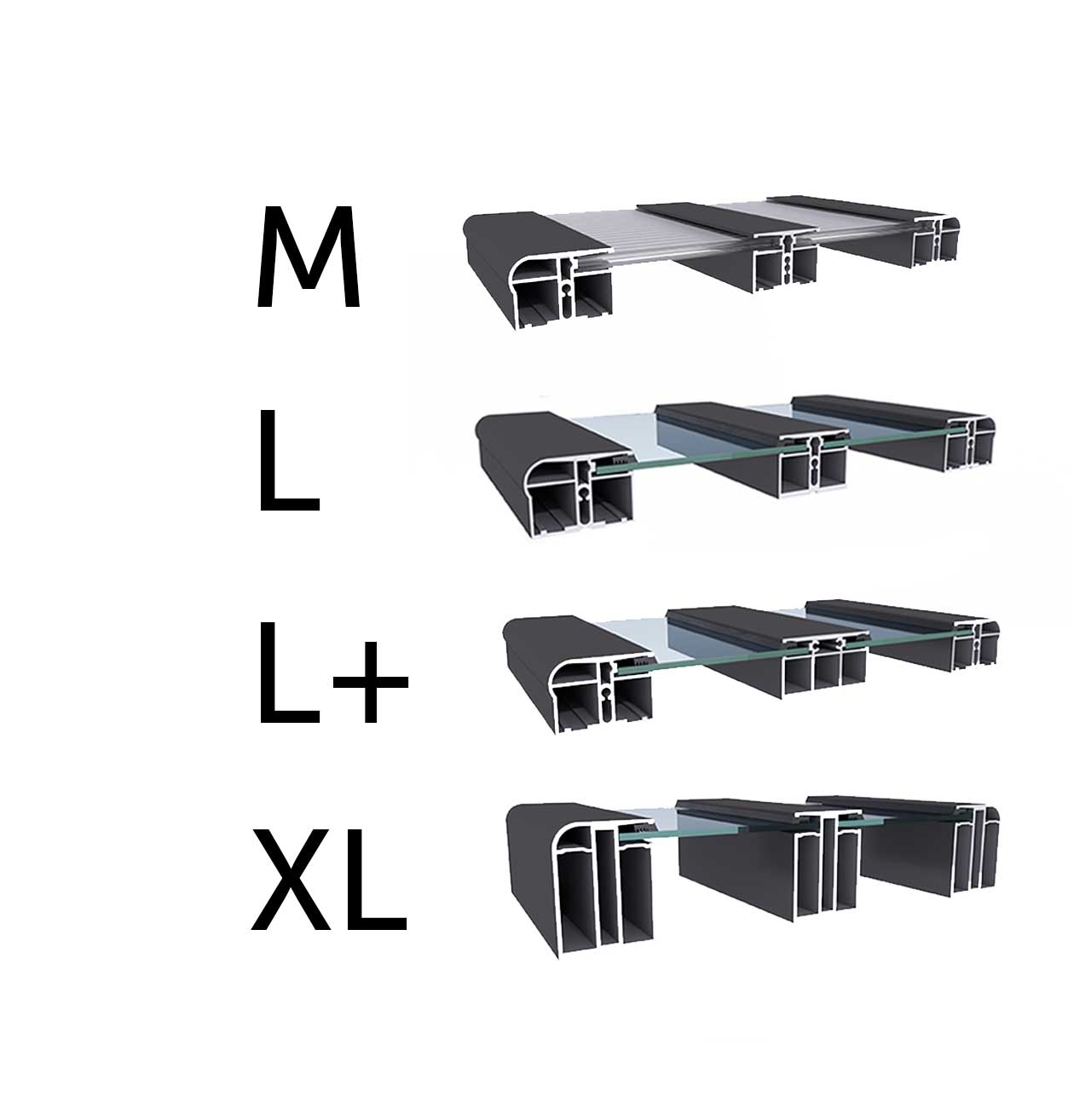 Profiles for large enclosures. The middle profile is larger compared to the L series.